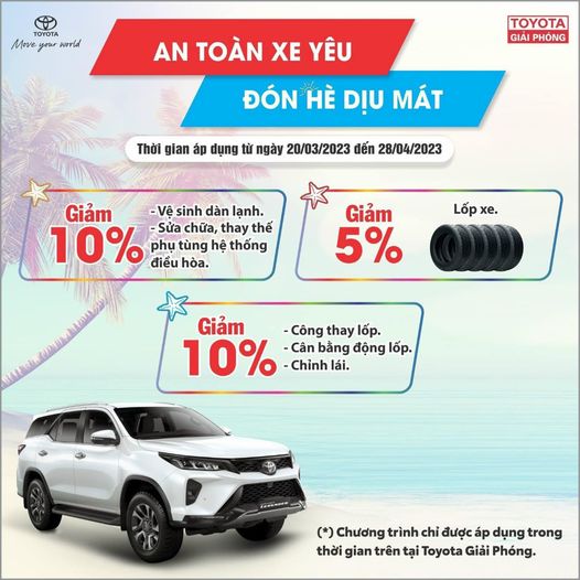 🚗🚗🚗Để chuẩn bị cho những chuyến nghỉ mát an toàn và đảm bảo sức khỏe trong mùa hè này. Toyota Giải Phóng hy vọng sẽ được đồng hành cùng Quý khách trên chặng đường sắp tới cùng các ưu đãi áp dụng từ ngày 𝟐𝟎/𝟑/𝟐𝟎𝟐𝟑 đ𝐞̂́𝐧𝟐𝟖/𝟎𝟒/𝟐𝟎𝟐𝟑: